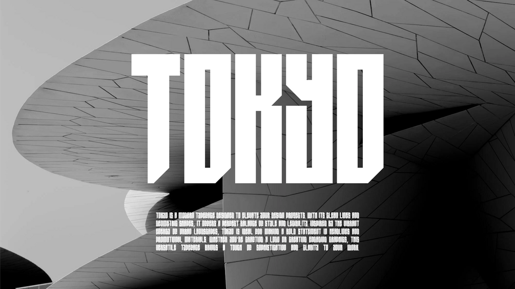TOKYO is a modern typeface designed to elevate your design projects. With its clean lines and geometric shapes, it offers a perfect balance of style and legibility. Inspired by the vibrant energy of urban landscapes, TOKYO is ideal for making a bold statement in headlines and promotional materials. Whether you're crafting a logo or creating engaging graphics, this versatile typeface brings a touch of sophistication and clarity to your work.